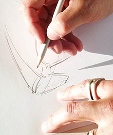 In dieser stimulierenden ersten Phase werden gemeinsam sogenannte Moodboards erstellt - Bildercollagen, die die kommenden Modetrends zeigen und anhand derer sich Tendenzen für Formen, Farben, Themen und Konzepte in der Modewelt erkennen lassen. Aber nicht nur die Modewelt spielt bei der Ideenfindung eine wichtige Rolle. Wer mit einem offenen Blick durch die Welt geht, wird überall Dinge entdecken, aus welchen sich neue Ideen schöpfen lassen. Ob architektonische Werke, Kunstgegenstände, bestimmte Farbkombinationen oder einfach die Natur, die uns umgibt – all das kann für einen kreativen Kopf inspirierend sein. In dieser ersten Phase werden alle Ideen in einem kreativen Brainstorming zusammengetragen. Die hieraus entstehenden Highlights schaffen dann die Basis, um mit dem Design so richtig loszulegen.