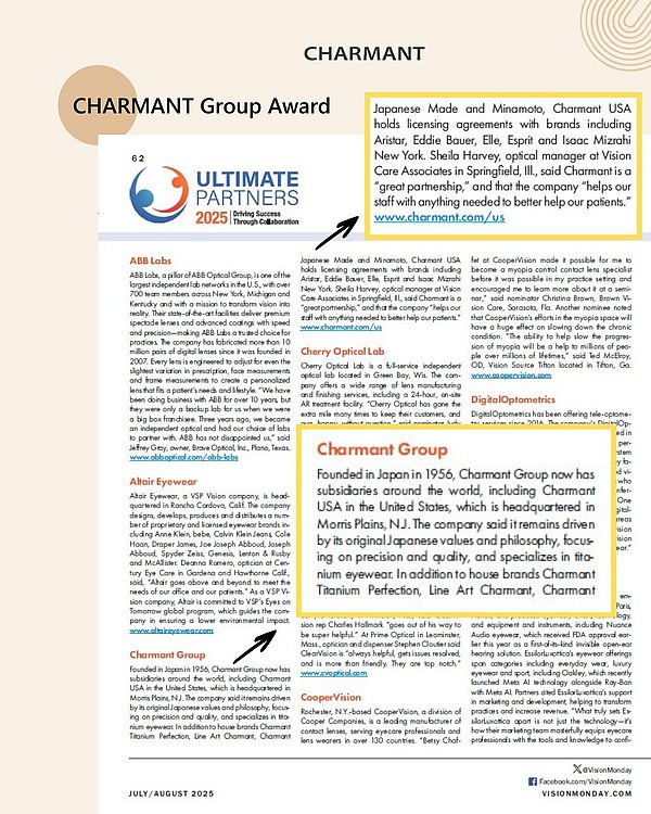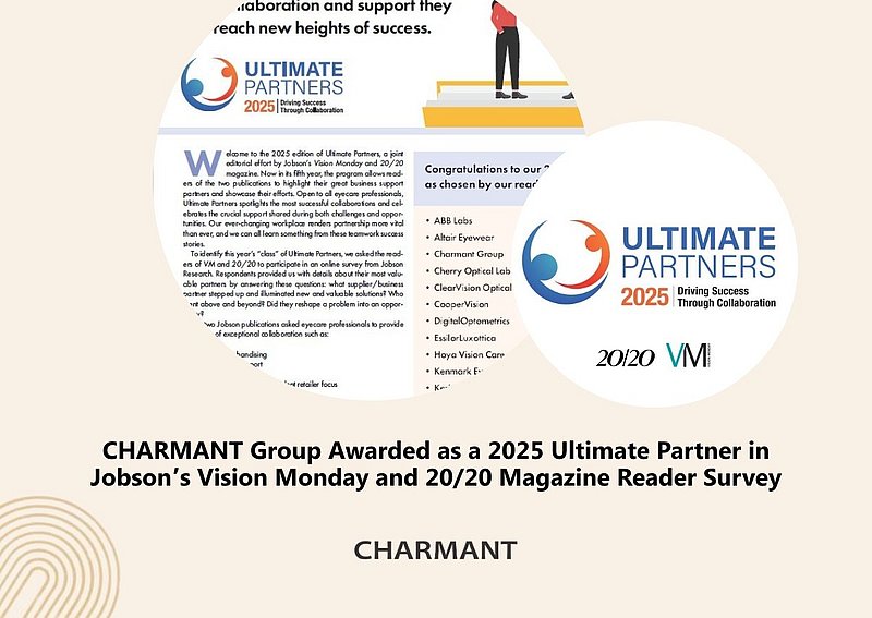 CHARMANT awarded as a 2025 Ultimate Partner in Jobson’s Vision Monday and 20/20 Magazine reader survey. This is the programs fifth year, allowing readers of both publications to highlight their great business support partners and showcase their efforts. Open to all eyecare professionals, an online survey was conducted, providing details about their most valuable partners by answering the following questions: what supplier/business partner stepped up and illuminated new and valuable solutions? Who went above and beyond? Did they reshape a problem into an opportunity?